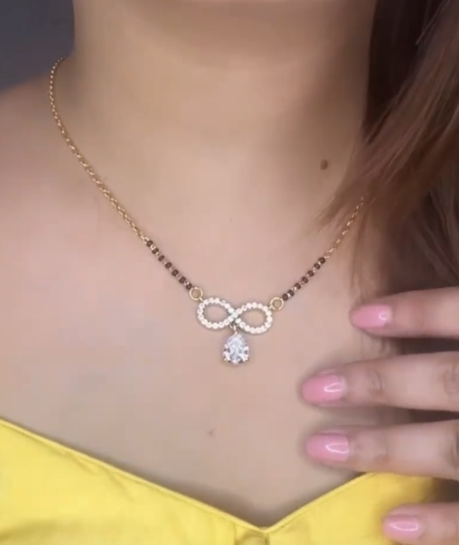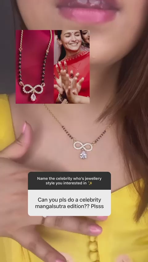 This Mangalsutra is inspired by Alia Bhat and is the perfect expression of eternal love. With an infinity design and diamond look, this mangalsutra stands out in its effortless modern look. The pear shaped stones evoke a classic feel while its sleek design ensures it looks modern. Perfect for expressing eternal love forever.