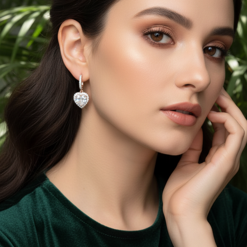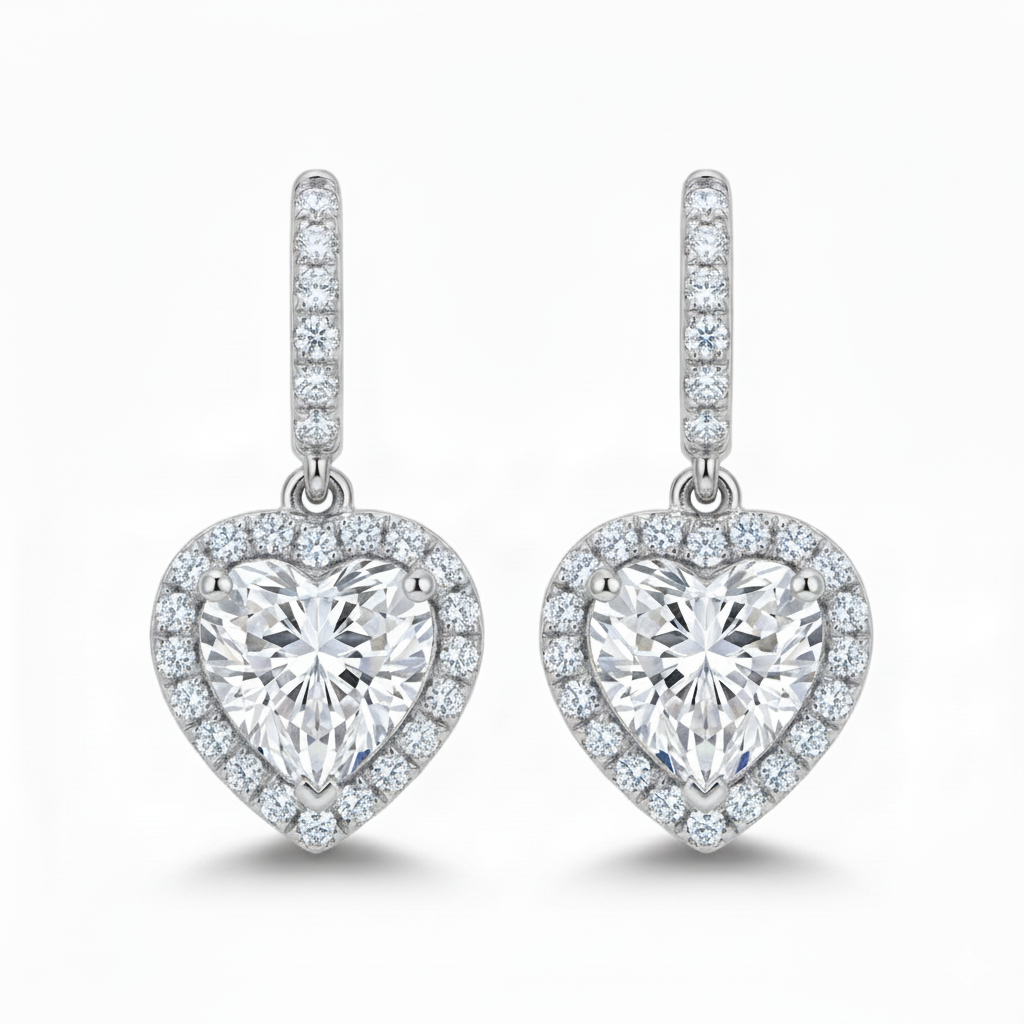 Introducing the Halo Heart Drops earrings, a radiant design that combines the classic elegance of a halo setting with a beautiful, dangling heart motif. These earrings are designed to move with you, catching the light with every turn.