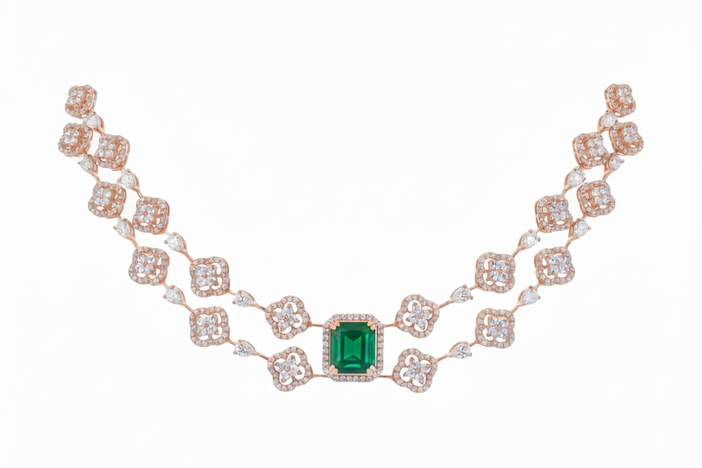 The Fresh Bloom Emerald Necklace is a beautiful fusion of contemporary design and traditional elegance. At its heart lies a mesmerizing emerald, exuding a sense of class and charm. The necklace features a beautiful fall of flower-shaped patterns that symbolize freshness and beauty. These patterns are meticulously crafted and studded with high-quality signity stones that give the piece the look and feel of real gold jewelry. The modern design of this necklace is perfect for those who appreciate the fusion of traditional and contemporary styles. Embrace the allure of the Fresh Bloom Emerald Necklace and add a touch of sophistication to your jewelry collection.