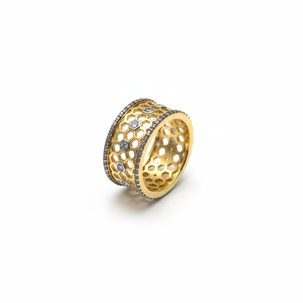 The Hexagon Mesh Band ring dazzles with its intricate design, expertly crafted from sterling silver 925 to mimic the opulence of genuine gold. Its stunning gold polish adds a touch of luxury, while a delicate white stone accentuates its elegance. Perfect for any occasion, it radiates the timeless charm of a wedding celebration.