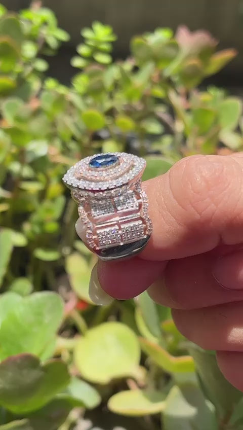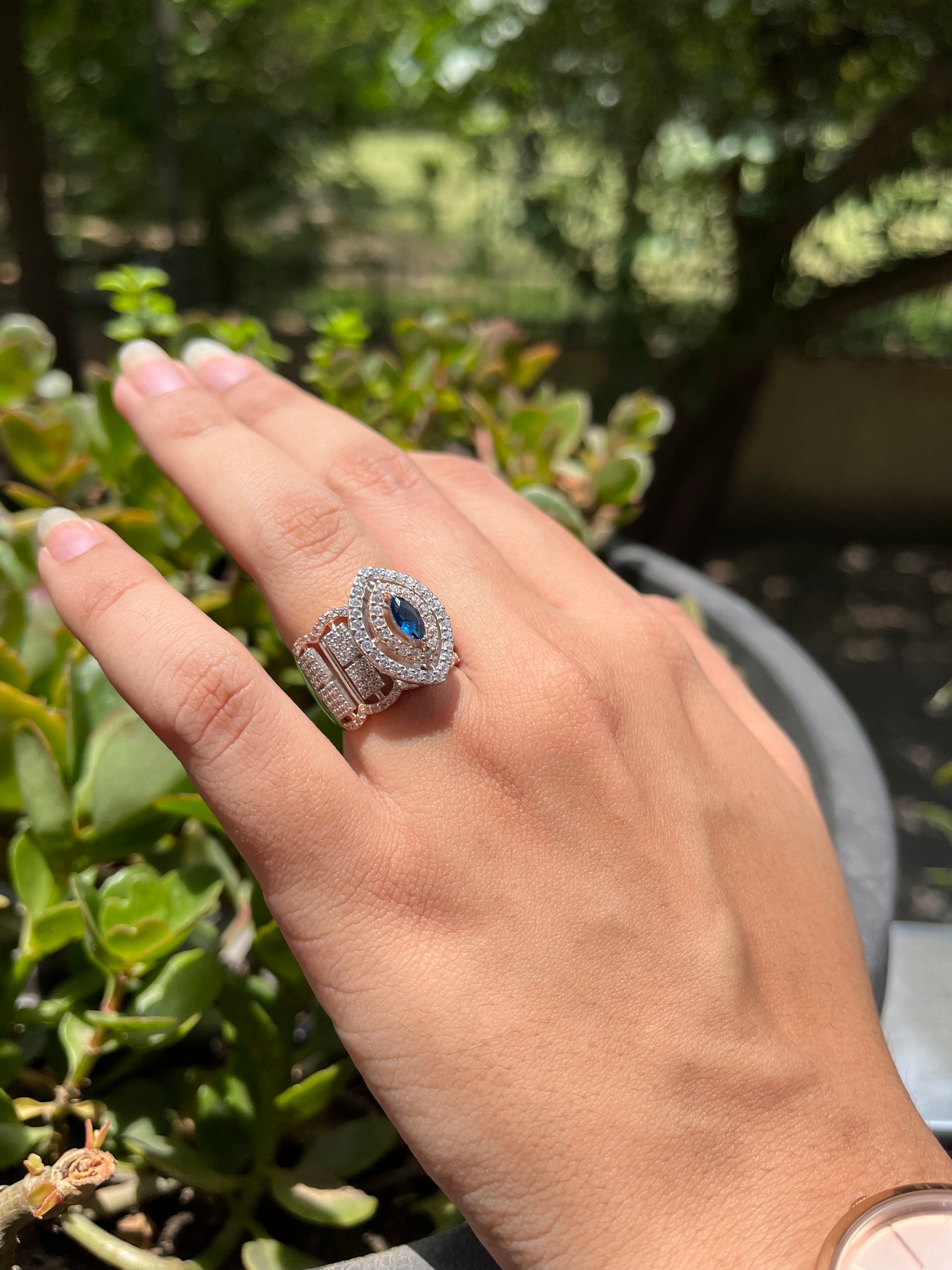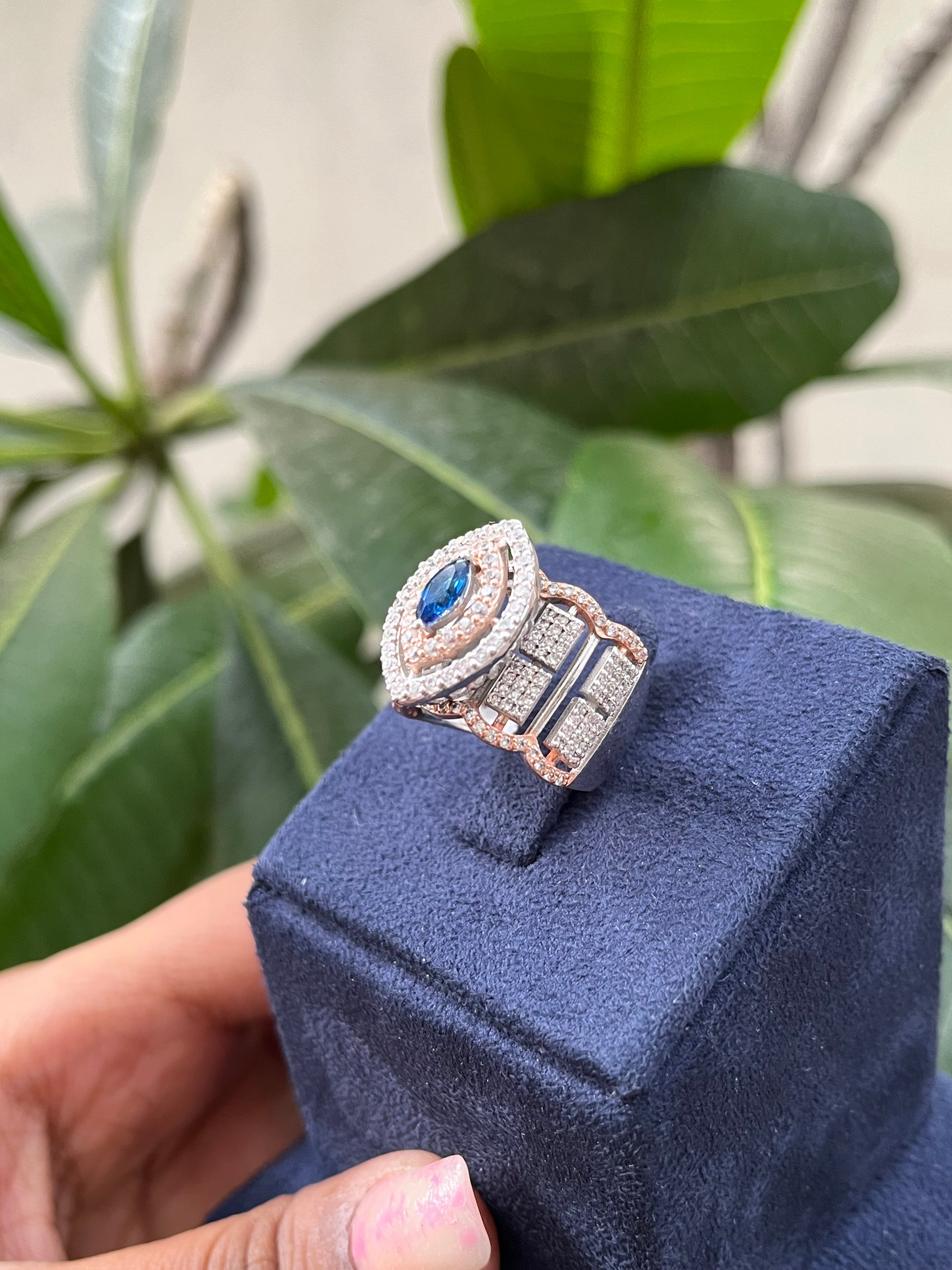 Kanika's Blue Sapphire Ring is an exquisite piece featuring a simple and beautiful floral design. Crafted in sterling silver 925, it mimics the allure of real gold with a luxurious rose gold polish. The centerpiece boasts a mesmerizing dark blue stone, elegantly complemented by surrounding white stones, creating a timeless and enchanting accessory