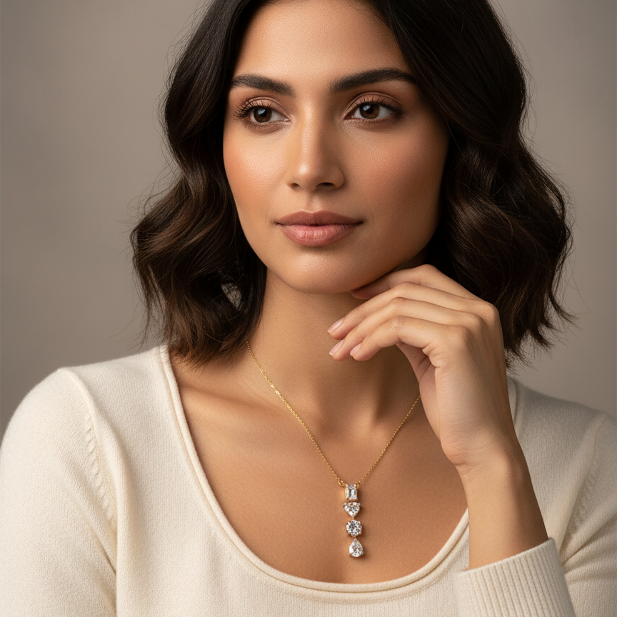 Introducing the Medley Pendant Chain: a masterpiece of elegance and grace. Crafted from sterling silver 925, it emanates the splendour of authentic gold with its lustrous gold polish. Embellished with a captivating white stone in diverse shapes, it exudes a bridal charm that's timeless. Each detail whispers tales of romance, making it a cherished emblem of everlasting love and unity.