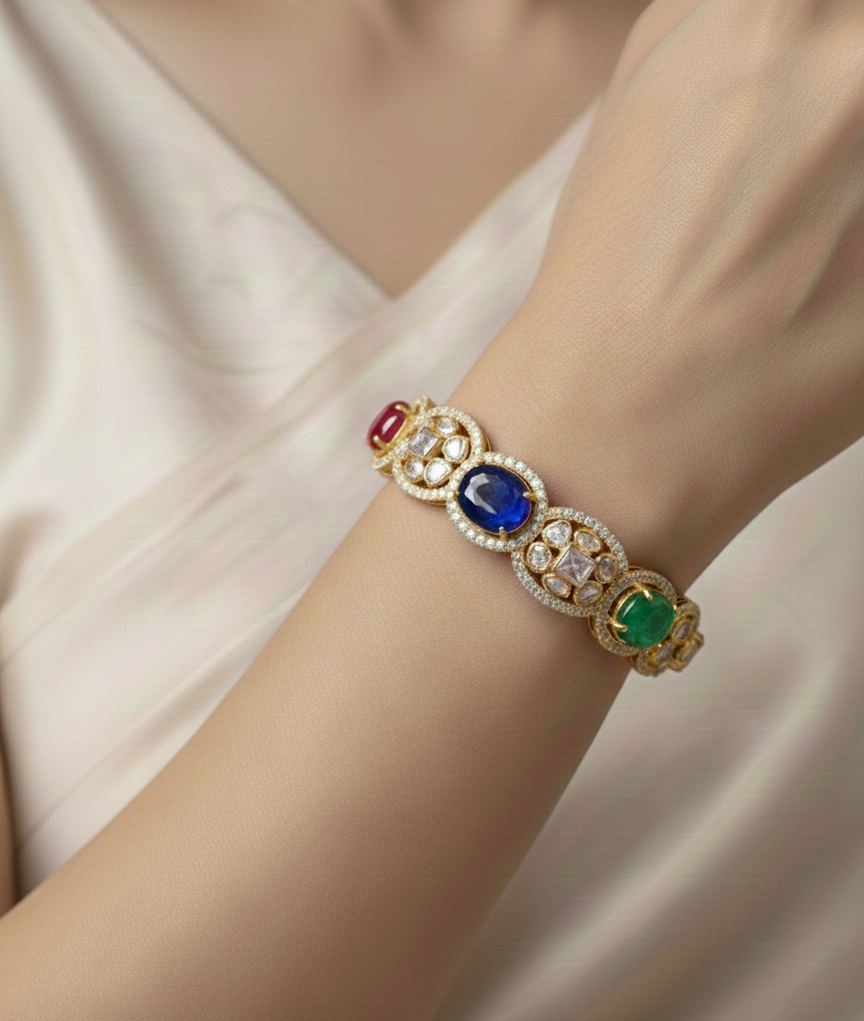 This Navratna Kada is expertly crafted in silver and features a stunning array of gemstones. With its beautifully customized design, it is a perfect accessory to add a touch of elegance and color to any outfit. Bring the healing benefits of gemstones to your daily life with this exquisite kada