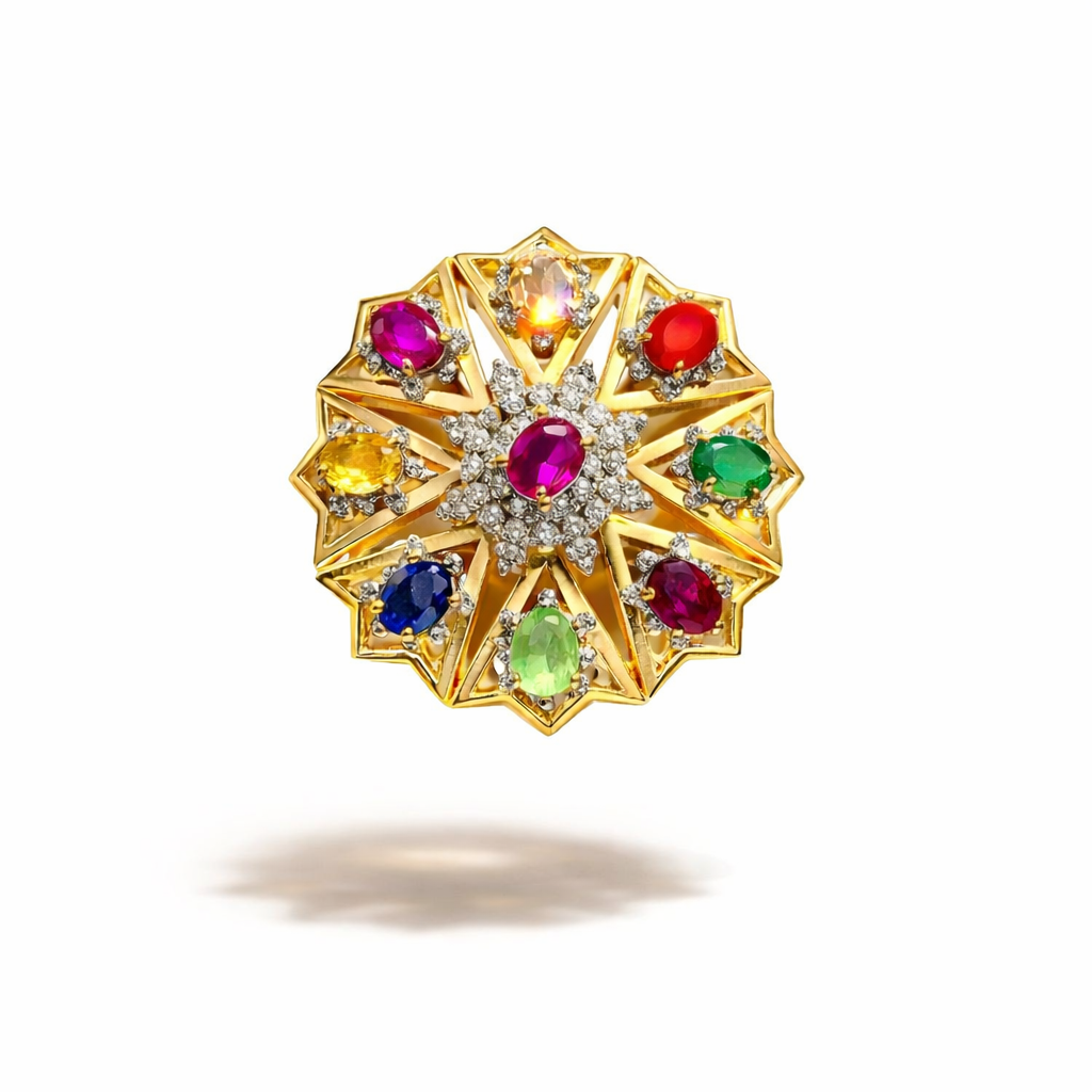 Embrace the ancient wisdom and vibrant beauty of the Navratna Ring a truly special piece featuring nine celestial gems. This ring is a powerful blend of tradition and modern elegance, designed to bring balance and good fortune.