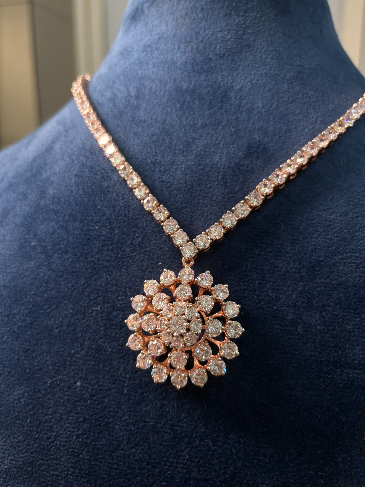 The Rose Mandala Collection is a complete jewelry suite that balances geometric precision with floral elegance. Inspired by the intricate patterns of the mandala, this set features a pendant, matching earrings, and a statement ring. Each piece is meticulously crafted to reflect light from every angle, creating a radiant aura perfect for significant occasions and bridal wear.