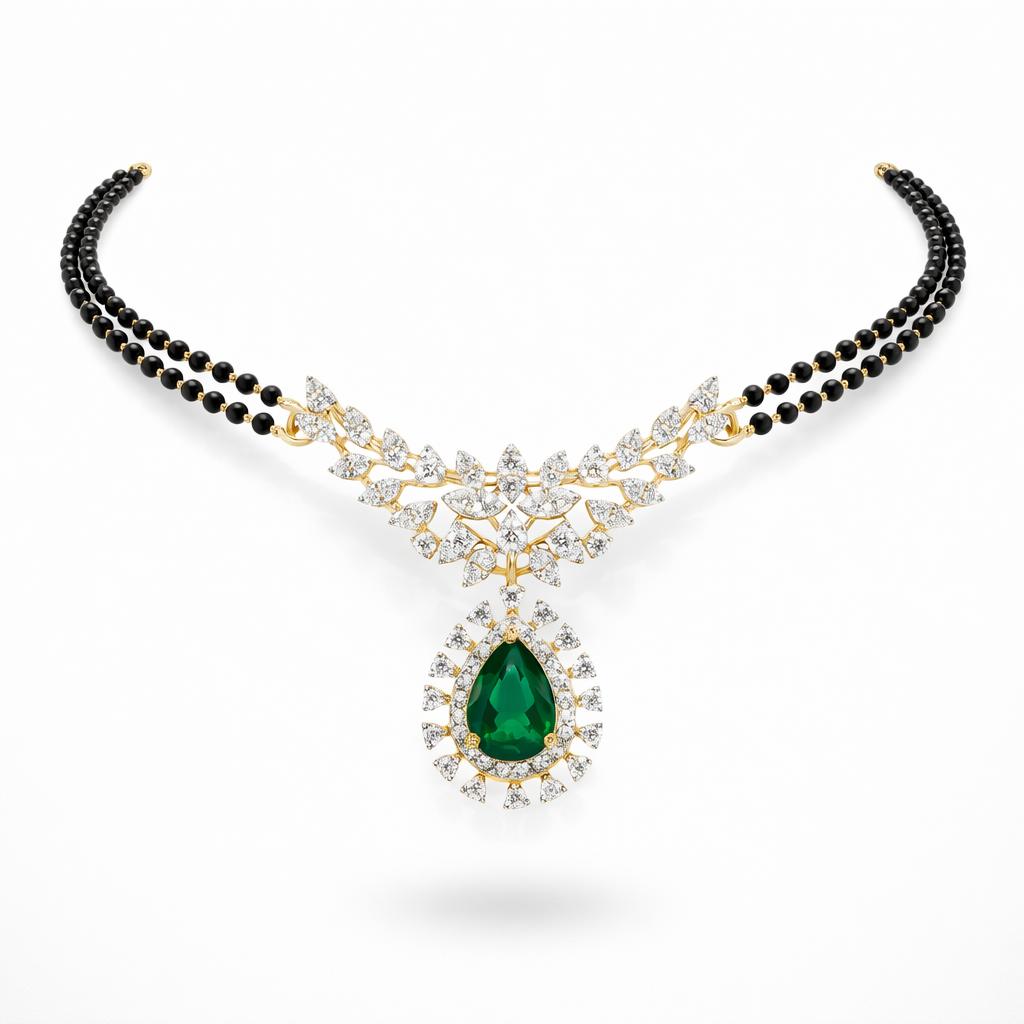 Crafted in sterling silver 925, this Mangalsutra necklace is reminiscent of a wedding symbol. Its design mirrors the richness of real gold while remaining affordable. A white diamond and emerald stone accentuate its allure, symbolizing the union of love and tradition in a beautiful, affordable piece.