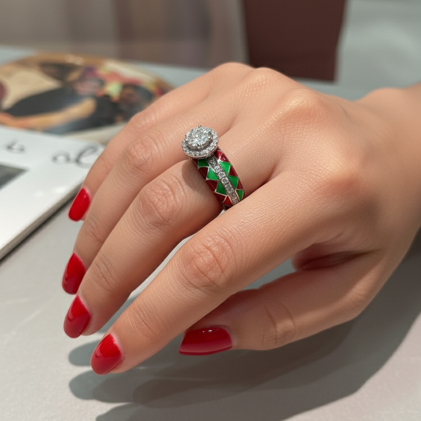 The Precious Blue Enamel Band is a stunning ring design crafted from sterling silver 925, exuding the elegance of real gold. It features a beautiful silver polish and is adorned with a vibrant blue enamel. Accented with sparkling white stones, this ring is perfect for party wear, offering a blend of sophistication and luxurious charm.