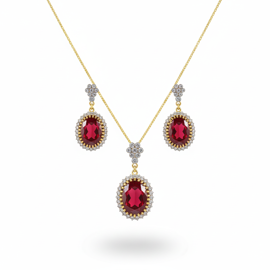 Drench yourself in the luxurious deep red of our Ruby Pendant Set, a timeless treasure designed to captivate. This stunning set features a dazzling pendant and matching earrings, perfectly combining classic elegance with modern craftsmanship.