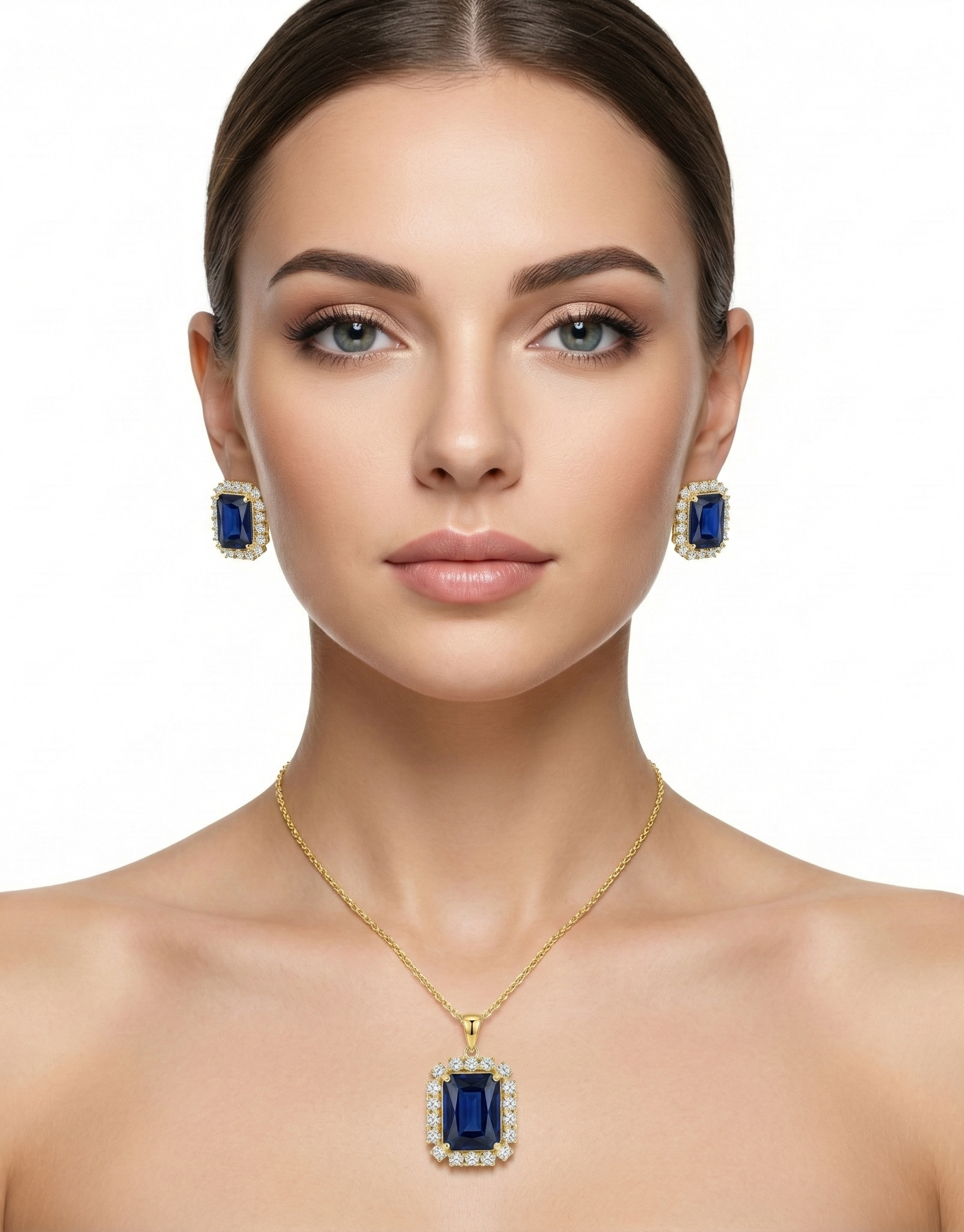 Elevate your style with this exquisite Sapphire Pendant Set. Featuring a stunning blue gemstone complemented by white diamonds, this set is a true showstopper. Its beautiful gold polish exudes an air of luxury, perfect for any party. Crafted in sterling silver 925, it offers the appearance of real gold without the hefty price tag, making it a must-have accessory.