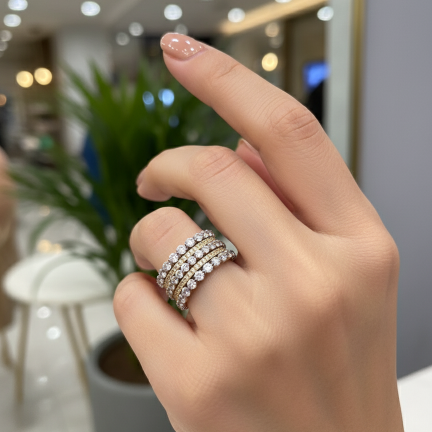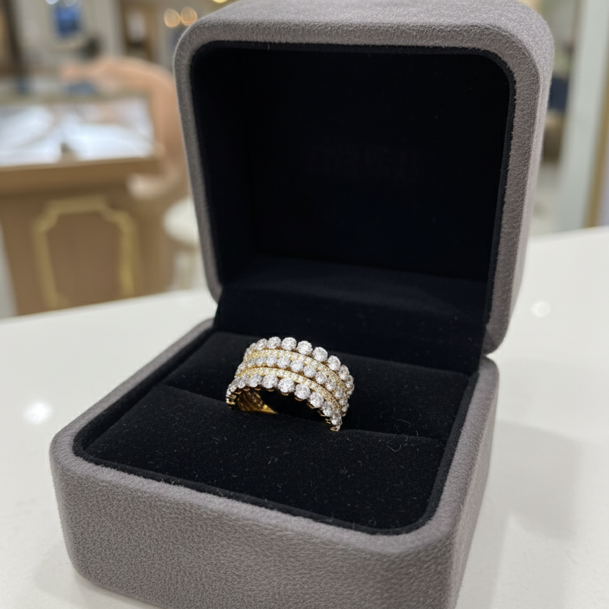 Embrace timeless elegance with The Trinity Band, a stunning ring designed to capture the light from every angle. This exquisite piece features three interlocking bands, creating a bold yet sophisticated stacked look that symbolizes unity and continuous radiance.
